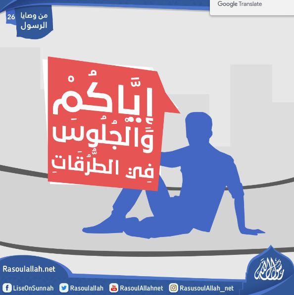 عَنْ النَّبِيِّ صَلَّى اللَّهُ عَلَيْهِ وَسَلَّمَ قَالَ: "إِيَّاكُمْ وَالْجُلُوسَ فِي الطُّرُقَاتِ" قَالُوا يَا رَسُولَ اللَّهِ مَا لَنَا مِنْ مَجَالِسِنَا بُدٌّ نَتَحَدَّثُ فِيهَا فَقَالَ رَسُولُ اللَّهِ صَلَّى اللَّهُ عَلَيْهِ وَسَلَّمَ "فَإِذَا أَبَيْتُمْ إِلَّا الْمَجْلِسَ فَأَعْطُوا الطَّرِيقَ حَقَّهُ" قَالُوا وَمَا حَقُّ الطريق قَالَ: "غَضُّ الْبَصَرِ وَكَفُّ الْأَذَى وَرَدُّ السَّلَامِ وَالْأَمْرُ بِالْمَعْرُوفِ وَالنَّهْيُ عَنْ الْمُنْكَرِ".