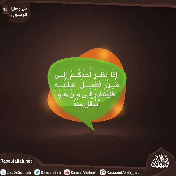 عن رسول اللَّهِ صَلَّى اللَّهُ عَلَيْهِ وَسَلَّمَ قَالَ "إِذَا نَظَرَ أَحَدُكُمْ إِلَى مَنْ فُضِّلَ عَلَيْهِ فِي الْمَالِ وَالْخَلْقِ، فَلْيَنْظُرْ إِلَى مَنْ هُوَ أَسْفَلَ مِنْهُ مِمَّنْ فُضِّلَ عَلَيْهِ".
