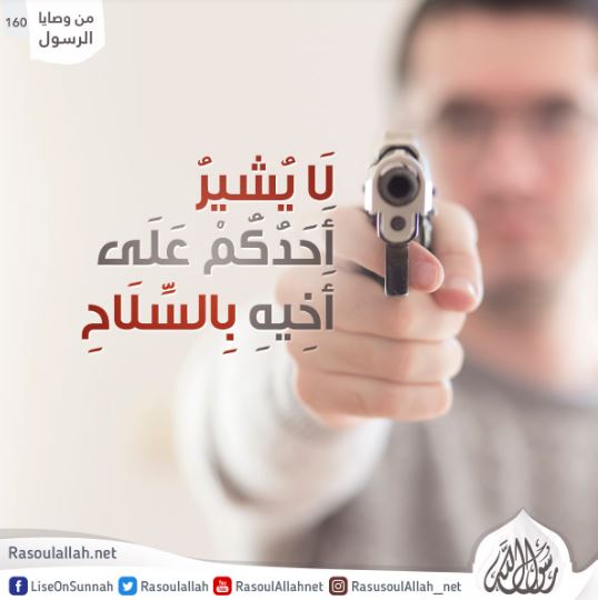"لَا يُشِيرُ أَحَدُكُمْ عَلَى أَخِيهِ بِالسِّلَاحِ فَإِنَّهُ لَا يَدْرِي لَعَلَّ الشَّيْطَانَ يَنْزِعُ فِي يَدِهِ فَيَقَعُ فِي حُفْرَةٍ مِنْ النَّارِ".