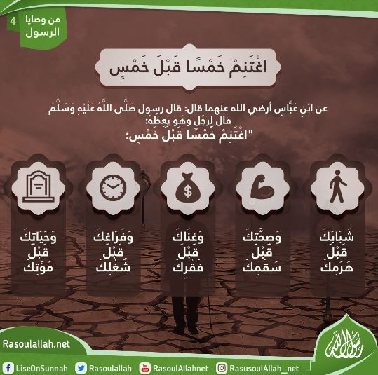 قال رسول صَلَّى اللَّهُ عَلَيْهِ وَسَلَّمَ - قَالَ لِرَجُلٍ وَهُوَ يَعِظُهُ: "اغْتَنِمْ خَمْسًا قَبْلَ خَمْسٍ: شَبَابَكَ قَبْلَ هَرَمِكَ، وَصِحَّتِكَ قَبْلَ سَقَمِكَ وَغِنَاكَ قَبْلَ فَقْرِكَ وَفَرَاغِكَ قَبْلَ شُغْلِكَ وَحَيَاتِكَ قَبْلَ مَوْتِكَ".