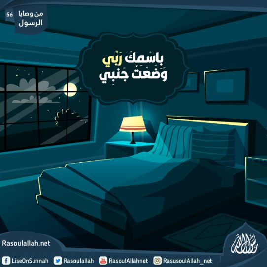 قَالَ النبي اللَّهِ صَلَّى اللَّهُ عَلَيْهِ وَسَلَّمَ: "إِذَا أَوَى أَحَدُكُمْ إِلَى فِرَاشِهِ فَلْيَنْفُضْ فِرَاشِهِ بِدَاخِلَةَ إِزَارِهِ؛ فَإِنَّهُ لَا يَدري مَا خَلَفَهُ عليه، ثُمَّ يَقُول: بِاسْمِكَ رَبِّي بِكَ وَضَعْتُ جَنْبِي وَبِكَ أَرْفَعُهُ، إِنْ أَمْسَكْتَ نَفْسِي فَارْحَمْهَا وَإِنْ أَرْسَلْتَهَا فَاحْفَظْهَا بِمَا تَحْفَظُ بِهِ عِبَادَكَ الصَّالِحِينَ.
