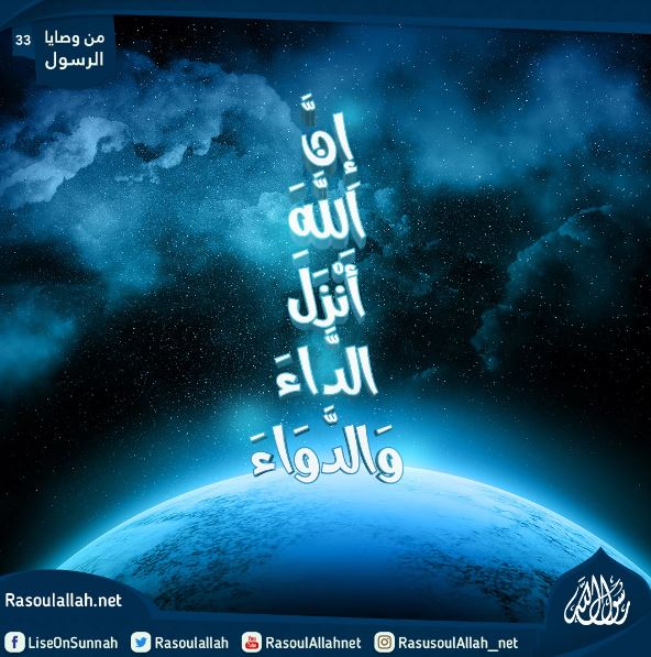 قَالَ رَسُولُ اللَّهِ صَلَّى اللَّهُ عَلَيْهِ وَسَلَّمَ: "إِنَّ اللَّهَ أَنْزَلَ الدَّاءَ وَالدَّوَاءَ، وَجَعَلَ لِكُلِّ دَاءٍ دَوَاءً، فَتَدَاوَوْا، وَلَا تَدَاوَوْا بِحَرَامٍ".