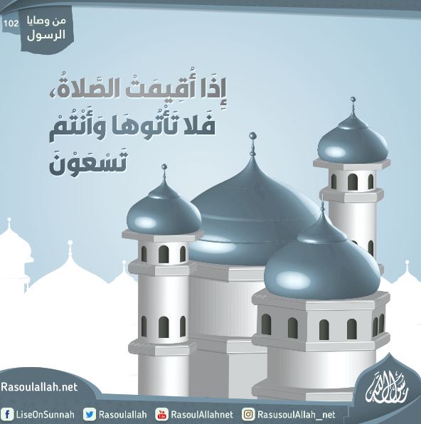 سَمعت رَسُولُ اللَّهِ صَلَّى اللَّهُ عَلَيْهِ وَسَلَّمَ يَقُول: "إِذَا أُقِيمَتْ الصَّلَاةُ، فَلَا تَأْتُوهَا وَأَنْتُمْ تَسْعَوْنَ وَأْتُوهَا تَمْشُونَ عَلَيْكُمْ السَّكِينَةُ فَمَا أَدْرَكْتُمْ فَصَلُّوا، وَمَا فَاتَكُمْ فَأَتِمُّوا".