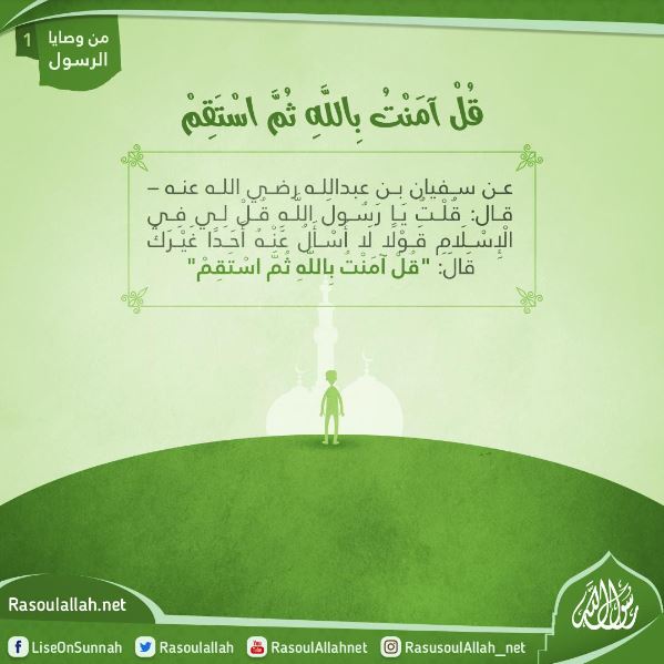 قُلْتُ يَا رَسُولَ اللَّهِ قُلْ لِي فِي الْإِسْلَامِ قَوْلًا لَا أَسْأَلُ عَنْهُ أَحَدًا غَيْرَكَ قَالَ: "قُلْ آمَنْتُ بِاللَّهِ ثُمَّ اسْتَقِمْ"