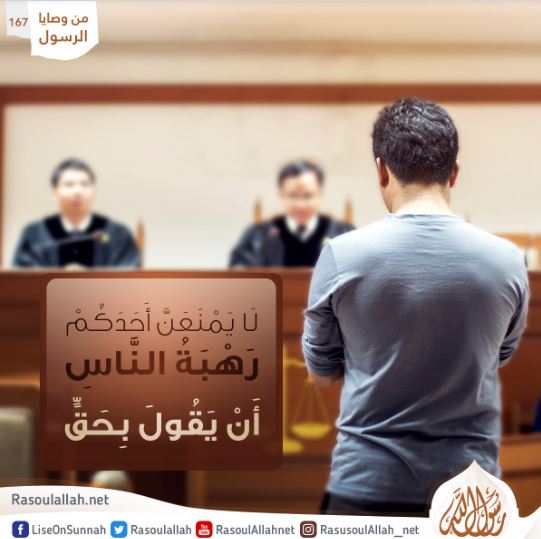 قَالَ رَسُولُ اللَّهِ صَلَّى اللَّهُ عَلَيْهِ وَسَلَّمَ: "أَلَا لَا يَمْنَعَنَّ أَحَدَكُمْ رَهْبَةُ النَّاسِ أَنْ يَقُولَ بِحَقٍّ إِذَا رَآهُ أَوْ شَهِدَهُ؛ فَإِنَّهُ لَا يُقَرِّبُ أَجَلاً، وَلَا يُبَاعِدُ مِنْ رِزْقٍ أَنْ يَقُولَ بِحَقٍّ أَوْ يُذَكِّرَ بِعَظِيمٍ".