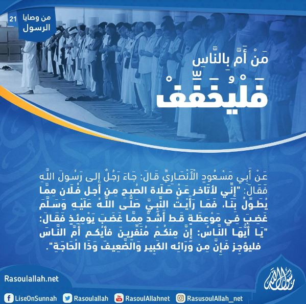 جَاءَ رَجُلٌ إلى رَسُولَ اللَّهِ فَقَالَ: "إِنِّي لأتَاخر عَنْ صَلَاة الصُبحِ مِن أَجل فُلَان مِمَّا يُطَوِّلُ بِنَا، فَمَا رَأَيْتُ النَّبِيَّ صَلَّى اللَّهُ عَلَيْهِ وَسَلَّمَ غَضِبَ فِي مَوْعِظَةٍ قَط أَشَدَّ مِمَّا غَضَبَ يَوْمِئِذٍ فَقَالَ: "يَا أَيُّهَا النَّاسُ: إِنَّ مِنكُمْ مُنَفِّرِينَ فأيُكم أَمَّ النَّاسَ فليؤجِز فَإِنَّ مِن وَرَائِه الكَبِير وَالضَّعِيفَ وَذَا الْحَاجَةِ".