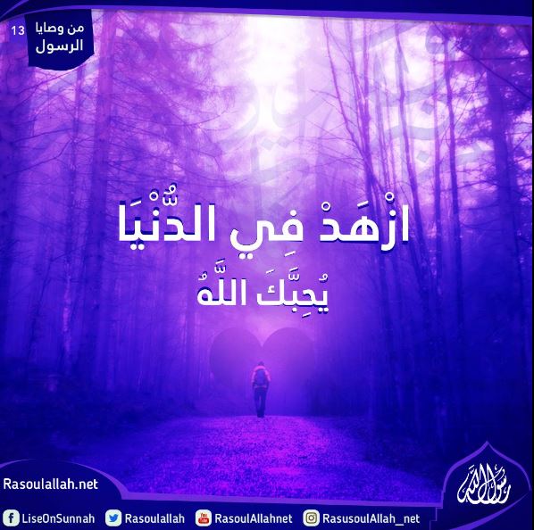 "جَاءَ رَجلٌ إِلّى النَّبِيَّ صَلَّى اللَّهُ عَلَيْهِ وَسَلَّمَ، فَقَالَ يَا رَسُولَ اللَّهِ دُلَّنِي عَلَى عَمَلٍ إِذَا عَمِلْتُهُ أَحَبَّنِي اللَّهُ وَأَحَبَّنِي النَّاسُ فَقَالَ: ازْهَدْ فِي الدُّنْيَا يُحِبَّكَ اللَّهُ، وَازْهَدْ فِيمَا عند النَّاسِ يُحِبَّكَ النَّاس".