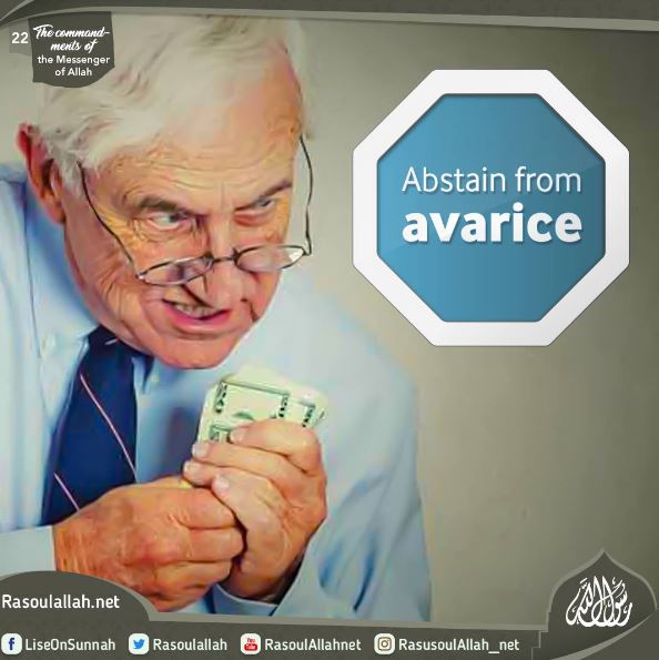 The Prophet, may the peace and blessings of Allah be upon him, warns us against avarice and shows us its bad consequences. He says: "abstain from avarice" ie, beware and save yourselves from it. Do not respond to it if it calls you to abstain from spending the money in your hands or to seek what is in the hands of the others, or to cut off the bonds of kinship and friendship among you, or to give up your religious and worldly duties; avarice is a grave disease that is accompanied by loss in this world and in the Hereafter