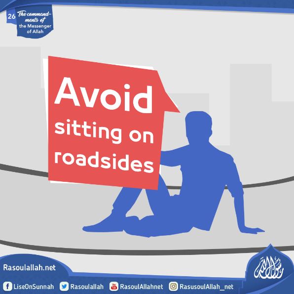 The Prophet, may the peace and blessings of Allah be upon him, said, "Avoid sitting on roadsides." His Companions said: "O Messenger of Allah, there is no other alternative but to sit there to talk." Thereupon the Messenger of Allah, may the peace and blessings of Allah be upon him, said, "If you insist on that, then fulfill the rights of the road." They asked: "What are their rights?" Thereupon he said, "Lowering the gaze (so that you may not stare at unlawful things); refraining from doing harm to others, responding to the greeting (i.e., saying 'Wa'alaikumus- salam…' to one another) and commanding the good and forbidding the evil."