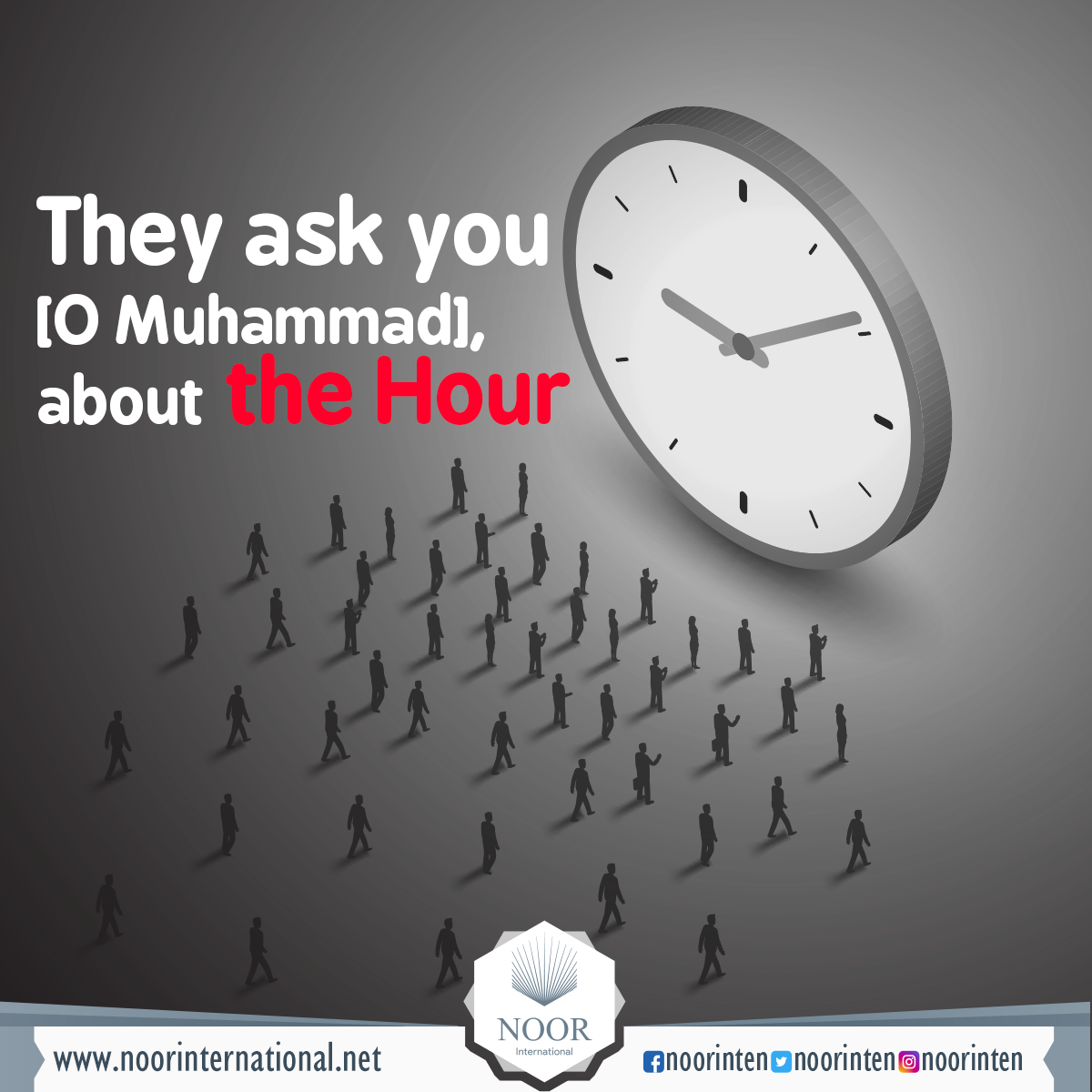 { They ask you, [O Muhammad], about the Hour: when is its arrival? Say, "Its knowledge is only with my Lord. None will reveal its time except Him. It lays heavily upon the heavens and the earth. It will not come upon you except unexpectedly." They ask you as if you are familiar with it. Say, "Its knowledge is only with Allah, but most of the people do not know." }