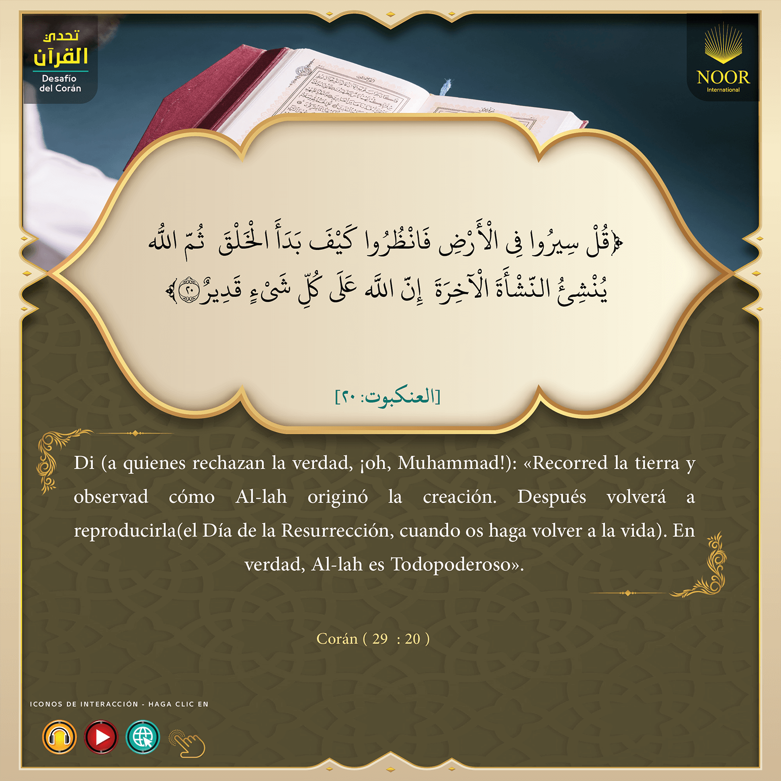 Di (a quienes rechazan la verdad, ¡oh, Muhammad!): «Recorred la tierra y observad cómo Al-lah originó la creación. Después volverá a reproducirla(el Día de la Resurrección, cuando os haga volver a la vida). En verdad, Al-lah es Todopoderoso».