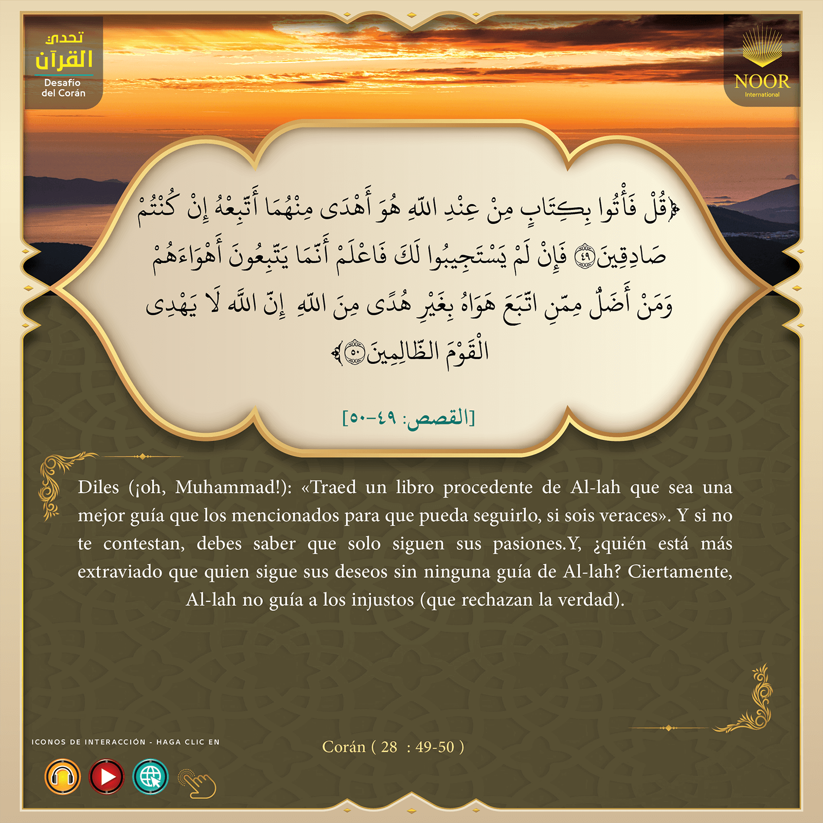 Diles (¡oh, Muhammad!): «Traed un libro procedente de Al-lah que sea una mejor guía que los mencionados para que pueda seguirlo, si sois veraces». Y si no te contestan, debes saber que solo siguen sus pasiones.Y, ¿quién está más extraviado que quien sigue sus deseos sin ninguna guía de Al-lah? Ciertamente, Al-lah no guía a los injustos (que rechazan la verdad).