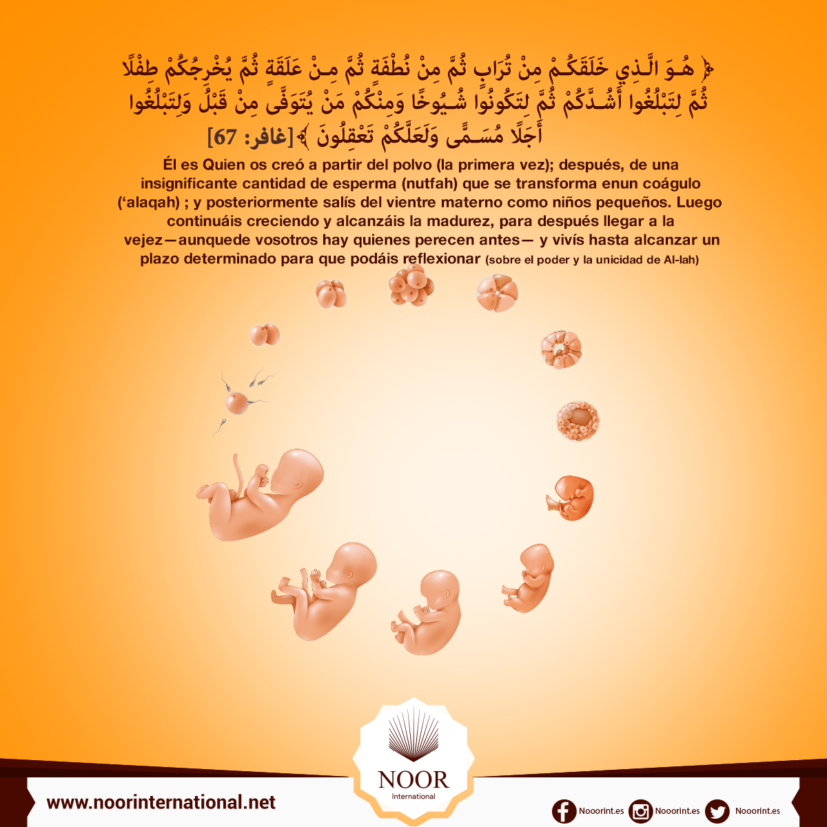Él es Quien los creó a partir del polvo (la primera vez); después, de una insignificante cantidad de esperma (nutfah) que se transforma en un coágulo (‘alaqah)[1]; y posteriormente salen del vientre materno como niños pequeños. Luego continúan creciendo y alcanzan la madurez, para después llegar a la vejez —aunque de ustedes hay quienes perecen antes— y viven hasta alcanzar un plazo determinado para que puedan reflexionar (sobre el poder y la unicidad de Al-lah).