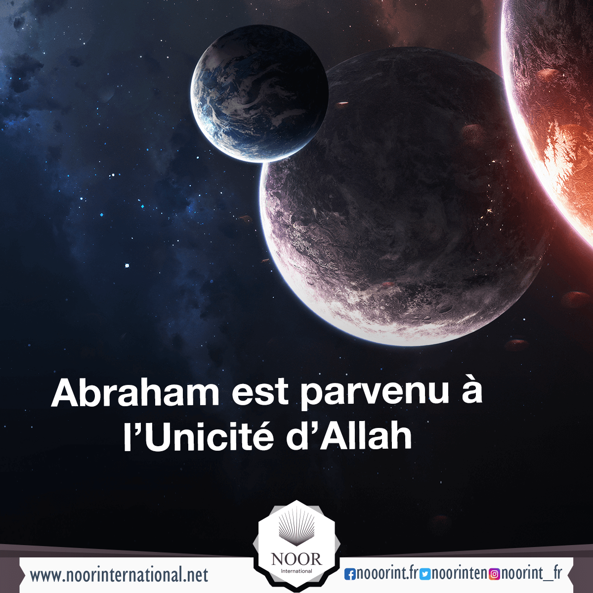 75-C’est alors ainsi que Nous montrâmes à Abraham la royauté des cieux et de la terre, pour qu’il fût de ceux qui croient avec certitude. 76-La nuit tombée, il vit un astre et dit : « Voilà mon Seigneur ! » Puis quand l’astre eut décliné, il se reprit : « Je n’aime pas ceux qui déclinent. » 77-Puis voyant poindre la lune, il dit : « Voilà mon Seigneur! » Et lorsqu’elle disparut, il se reprit : « Si mon Seigneur ne me guide pas, je serai du nombre des égarés. 78- Puis voyant apparaître le soleil, il dit : « Voilà mon Seigneur ! Celui-ci est bien plus grand. » Et lorsque (le soleil) se fut couché, il se reprit : « Ô peuple mien ! Je désavoue les associés (que vous donnez à Allah). 79-Je tourne mon visage, en pur monothéiste, vers Celui Qui a créé (sans modèle préalable) les cieux et la terre, et je ne suis point de ceux qui Lui associent des émules. »