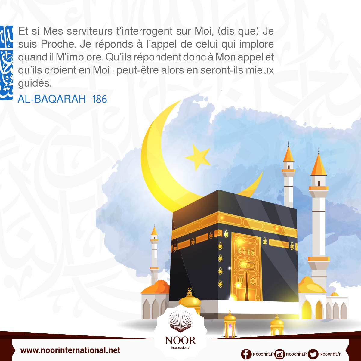 Et si Mes serviteurs t’interrogent sur Moi, (dis que) Je suis Proche. Je réponds à l’appel de celui qui implore quand il M’implore. Qu’ils répondent donc à Mon appel et qu’ils croient en Moi : peut-être alors en seront-ils mieux guidés.