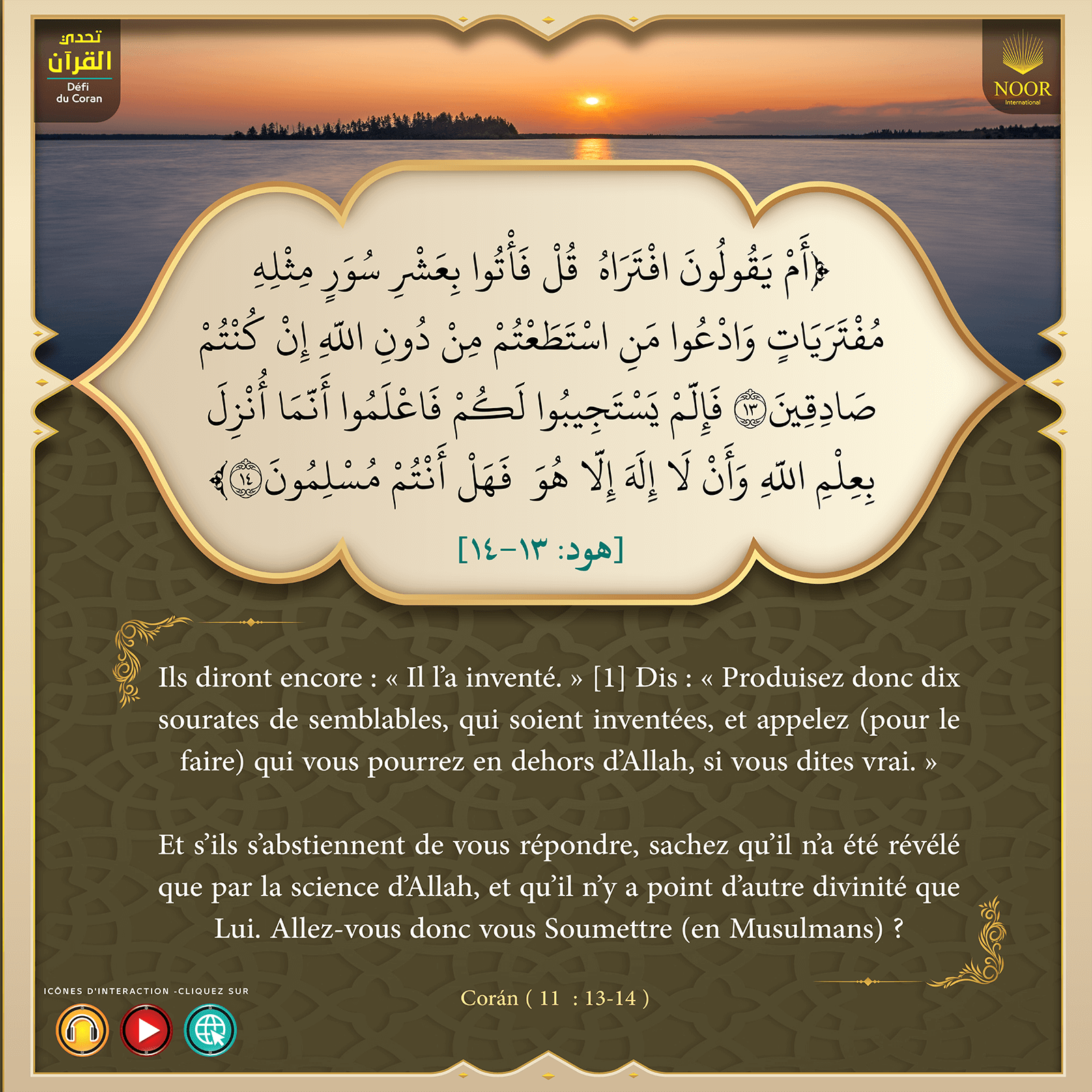 Ils diront encore : « Il l’a inventé. » [1] Dis : « Produisez donc dix sourates de semblables, qui soient inventées, et appelez (pour le faire) qui vous pourrez en dehors d’Allah, si vous dites vrai. » Et s’ils s’abstiennent de vous répondre, sachez qu’il n’a été révélé que par la science d’Allah, et qu’il n’y a point d’autre divinité que Lui. Allez-vous donc vous Soumettre (en Musulmans) ?