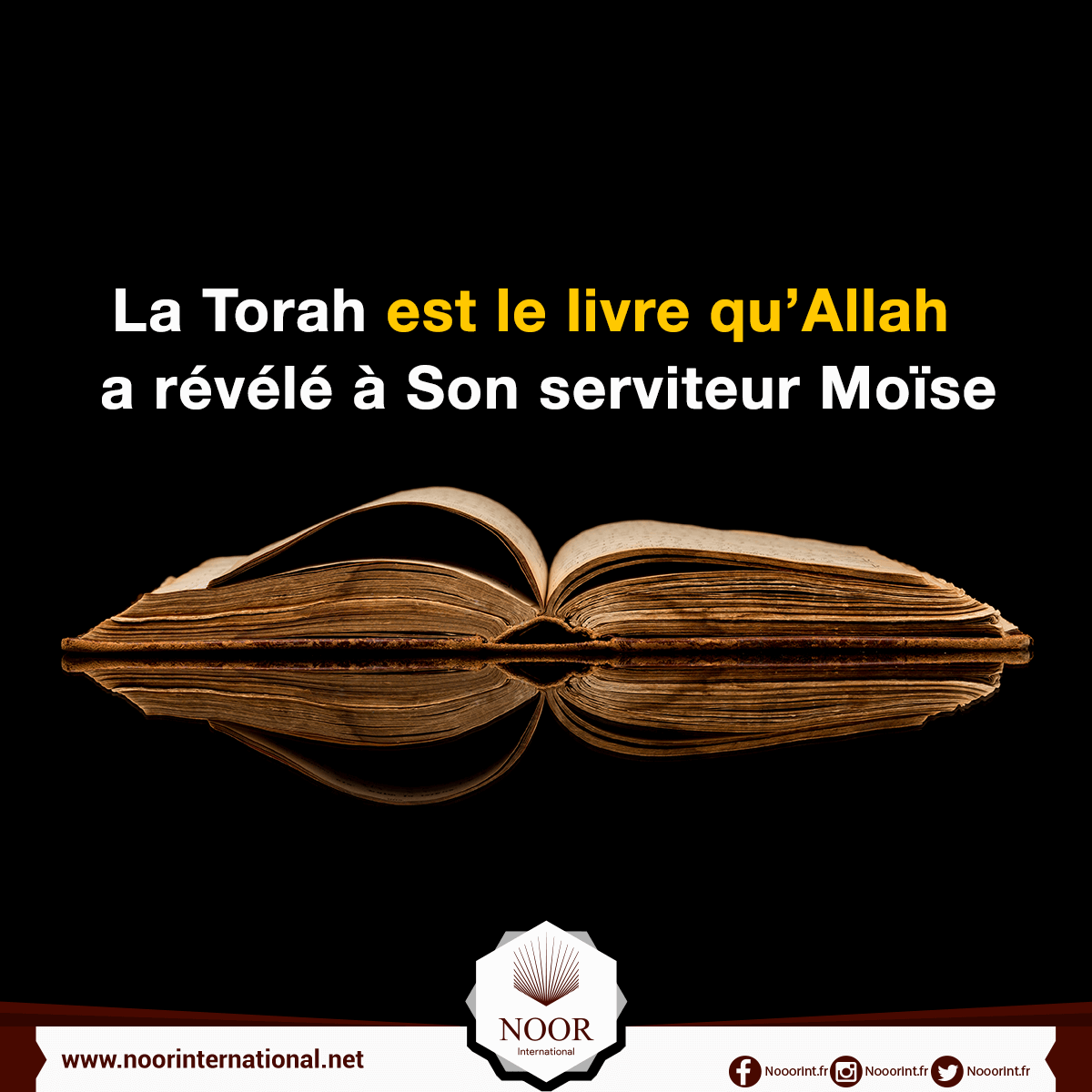 Tout comme le Coran est le livre d’Allah révélé à Son serviteur Muhammad et l’Évangile le livre d’Allah révélé au Messie, la Torah est le livre d’Allah révélé à Moïse.