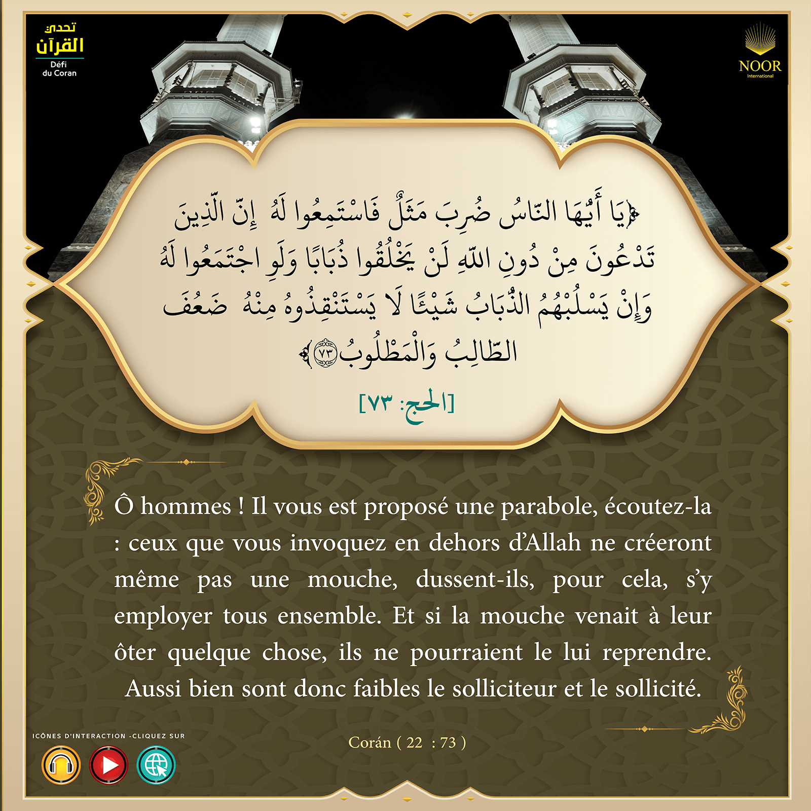 Ô hommes ! Il vous est proposé une parabole, écoutez-la : ceux que vous invoquez en dehors d’Allah ne créeront même pas une mouche, dussent-ils, pour cela, s’y employer tous ensemble. Et si la mouche venait à leur ôter quelque chose, ils ne pourraient le lui reprendre. Aussi bien sont donc faibles le solliciteur et le sollicité.