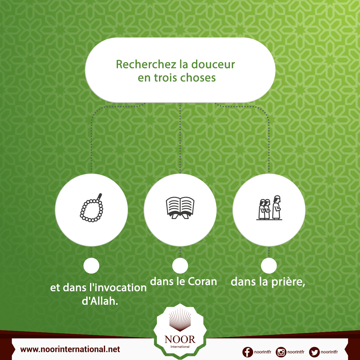Recherchez la douceur en trois choses : dans la prière, dans le Coran et dans l'invocation d'Allah. Si vous l'y trouvez, continuez et réjouissez-vous. Si vous ne l'y trouvez pas, sachez que votre porte est fermée.