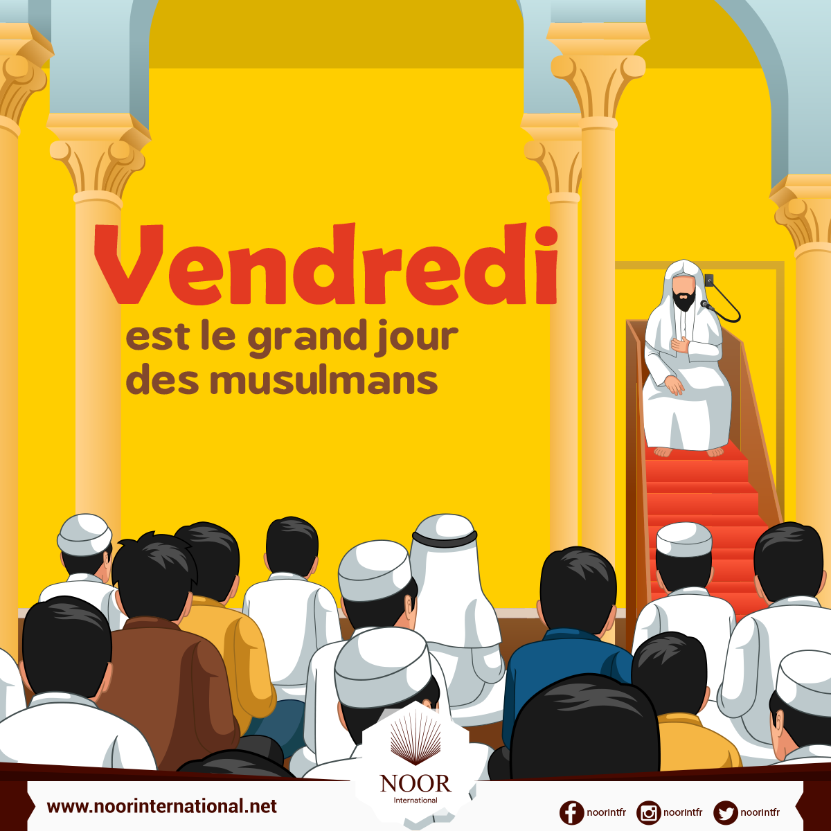 Vendredi est le jour où se rassemblent les musulmans et écoutent l'imam dire son prêche. Ne laisse pas passer ce jour sans que tu t'y sois préparé rituellement et que tu aies adressé à Allah des suppliques, car il y a en ce jour une heure où il est répondu aux prières.